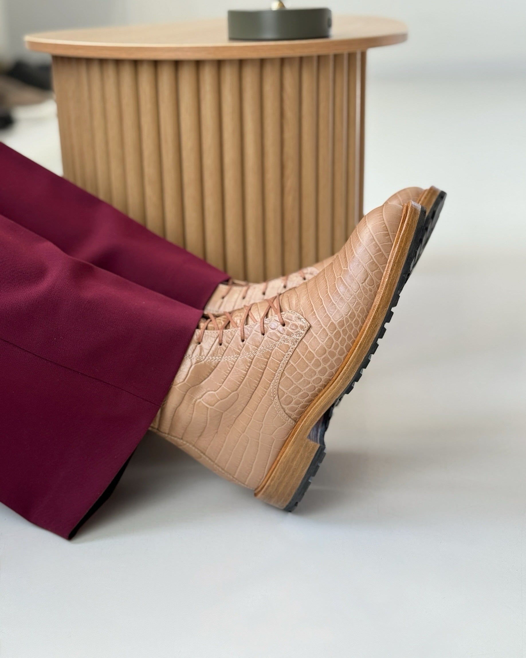 Lovidovi B3 Croco Boots feature a distinctive crocodile-patterned leather design, a premium leather sole, and refined black stitch construction. Elegant and sophisticated, these boots embody timeless style and modern craftsmanship, making them the perfect choice for both formal occasions and smart-casual wear.